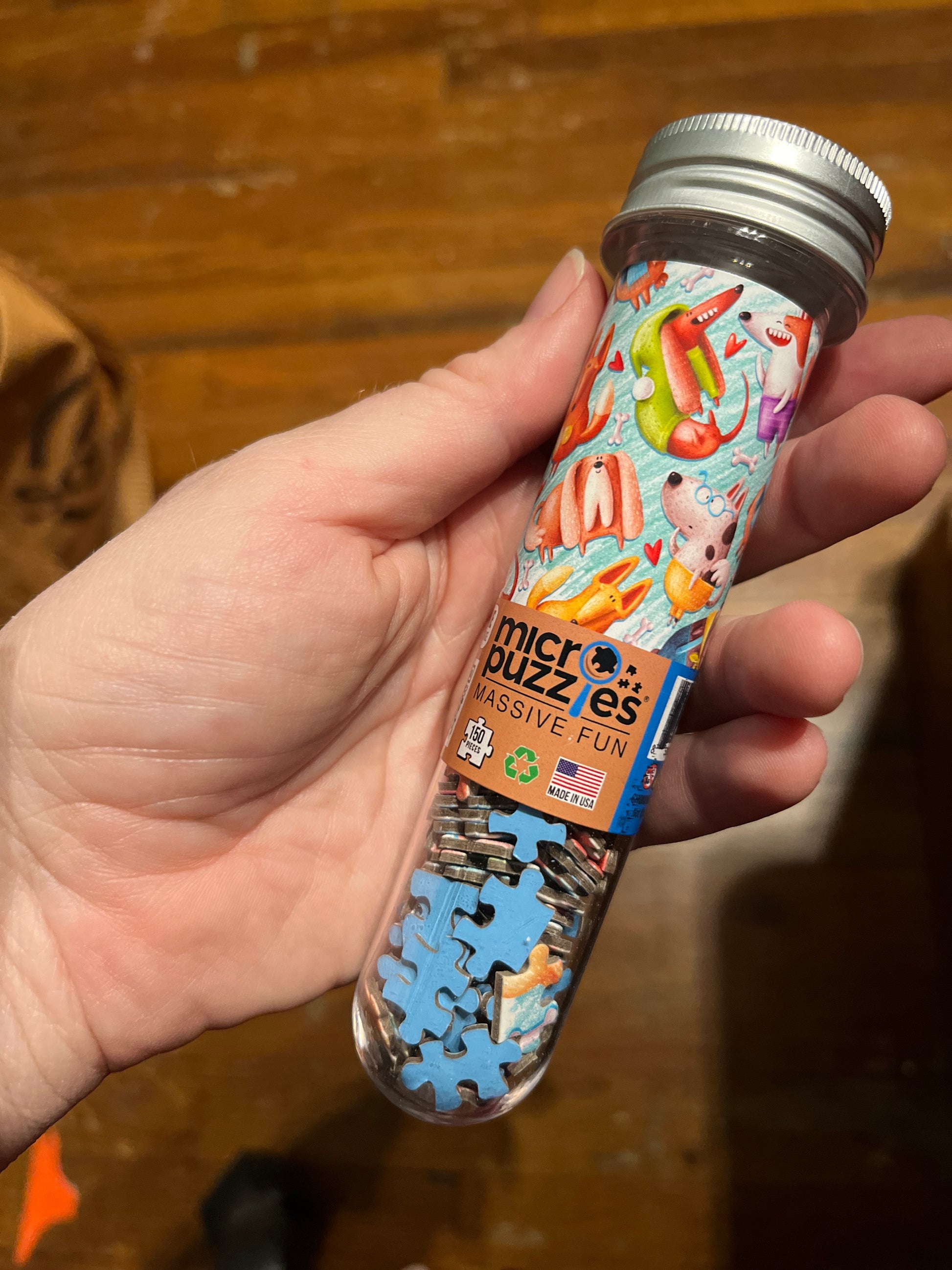 Tube of tiny puzzle! Available in four different styles: Cats, Dogs, BigFoot & Woodland Animals. With 150 pieces, this finished puzzle measures 4"x6".